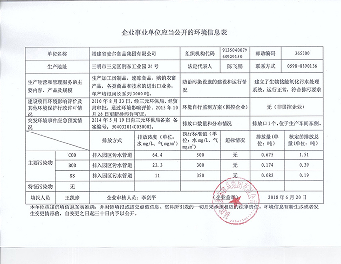 福建省麥爾食品集團有限公司環(huán)境信息公示